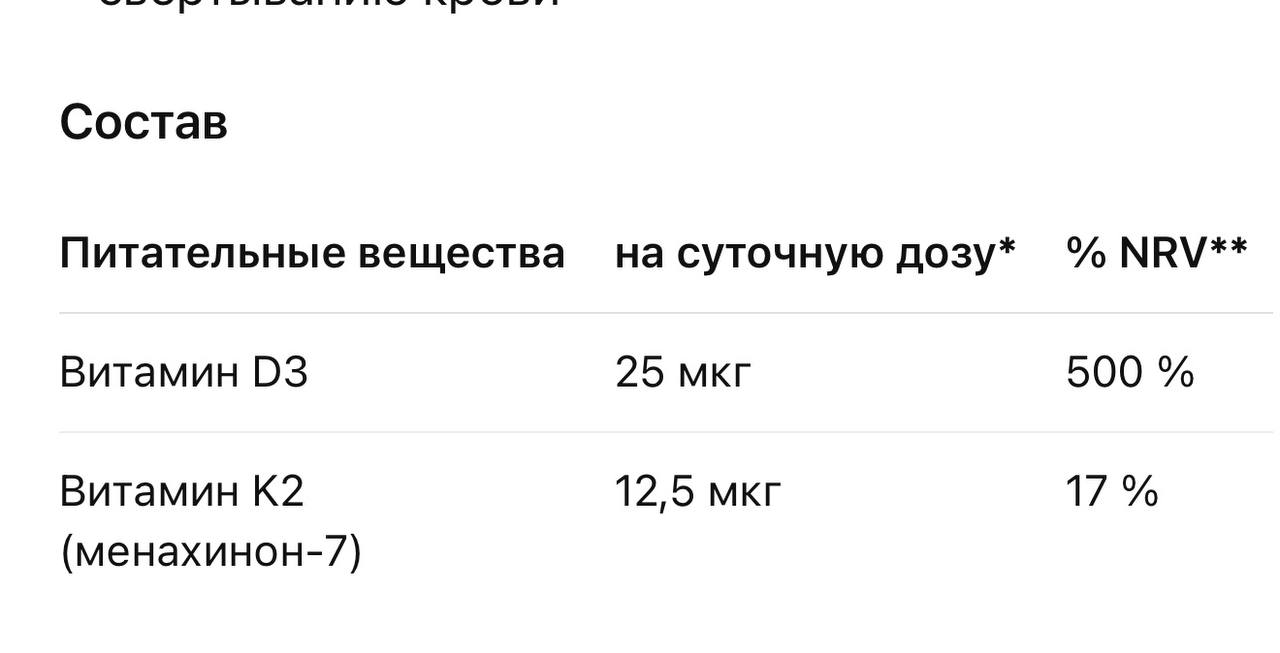 Возможные области применения • для дополнительного обеспечения организма важными витаминами D3 и K2 в форме капель • витамины D и K способствуют поддержанию нормального состояния костей • витамин D участвует в нормальной работе иммунной системы • витамин D способствует поддержанию нормального уровня кальция в крови, а также нормальному усвоению и использованию кальция и фосфора в организме • витамин K способствует нормальному свертыванию крови